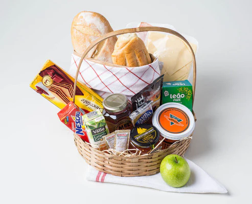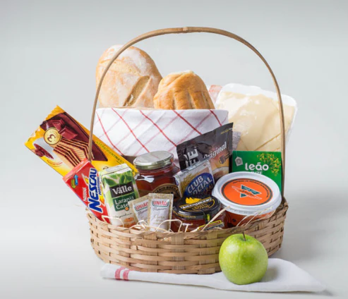 Mesmo estando distante, é possível mostrar para alguém especial que você está presente em momentos importantes com essa cesta de café da manhã. Completa, ela traz biscoitos, frutas, bebidas, frios, pães, bolo, cream cheese e manteiga.