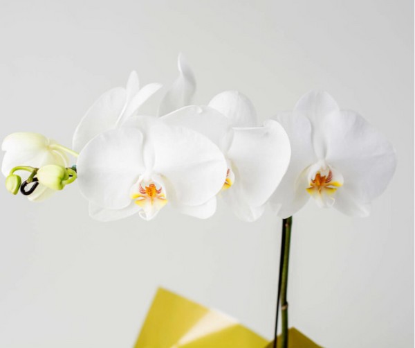A Orquídea Phalaenopsis na cor branca representa amor puro. Para oferecer um presente completo, ela vem acompanhada por um urso de pelúcia e uma caixa de bombons, tudo delicadamente embrulhado.